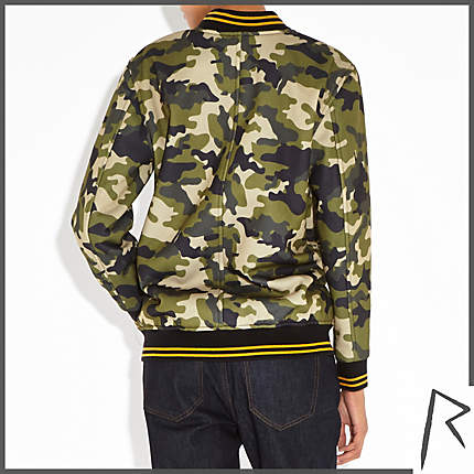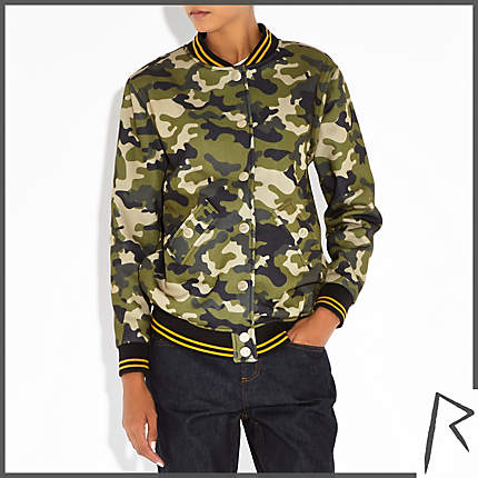 Rihanna for River Island. Nothing says cool off-duty like this camo print varsity jacket. With two of this season’s hottest trends rolled into one, this features authentic black and yellow stripe trims with popper through fastening and two pockets.