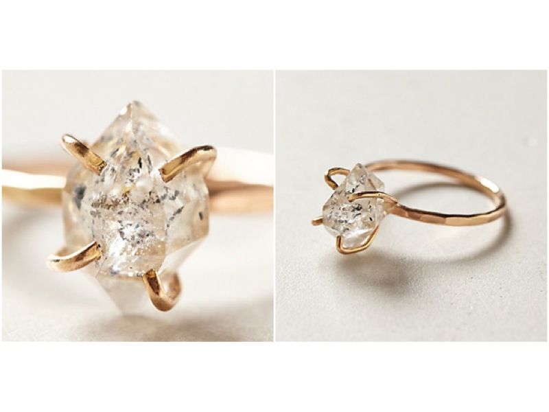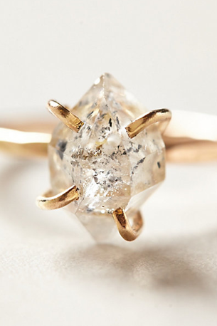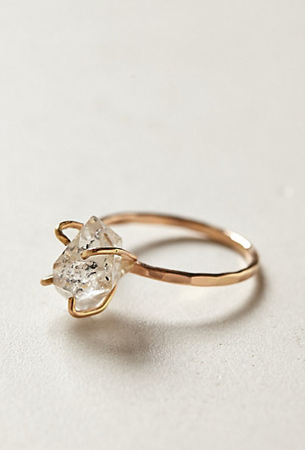 Alana Douvros imagines faraway landscapes when designing her jewelry. She handcrafts her pieces into rugged shapes with natural elements in bold color combinations. This light-catching quartz crystal ring is ruggedly stunning, a natural statement piece.
