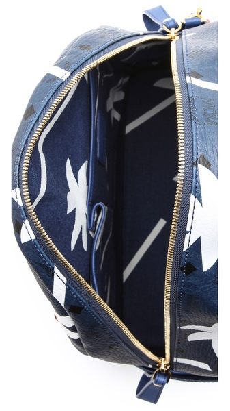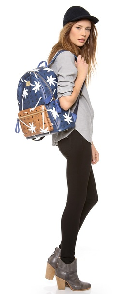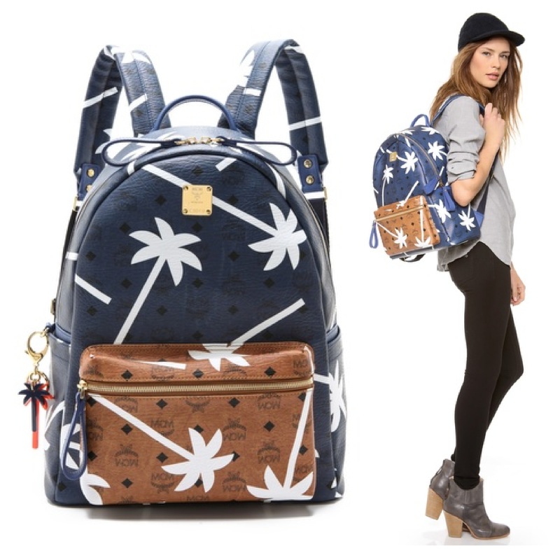 This sturdy backpack is made from resilient coated canvas in a palm tree print. A gold-tone logo plate and 3 pockets detail the outside. The zip top opens to an interior with a file pocket, a zip compartment, and an optional key ring. Padded adjustable shoulder straps and locker loop. Dust bag included.