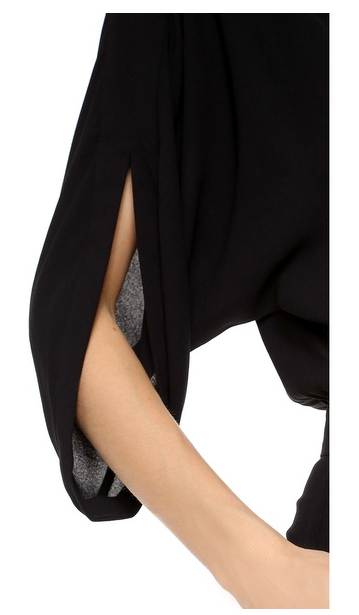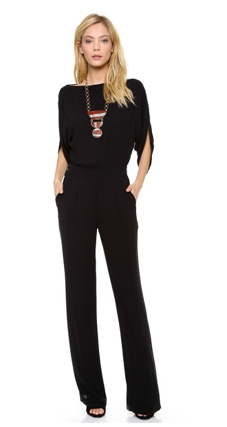 Pleats add volume to a wide-leg DVF jumpsuit, styled with a flattering boat neckline. Dolman sleeves accentuate the blouson bodice. Buttoned back keyhole and slant hip pockets. Hidden side zip.