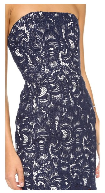 Contrast lining accentuates the romantic patterned lace on a strapless Nicholas dress. Flexible boning structures the bodice, and the sheer hem falls in soft scallops. Hidden back zip. Lined.