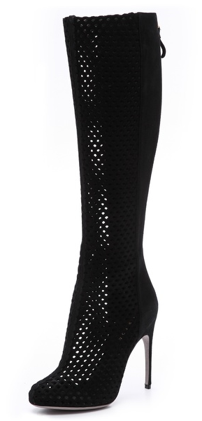 Delicate, scalloped perforations put a sheer twist on these sexy suede Sergio Rossi boots. Rounded toe and solid center seam. Hidden platform and sculpted stiletto heel. Back zip. Leather sole.