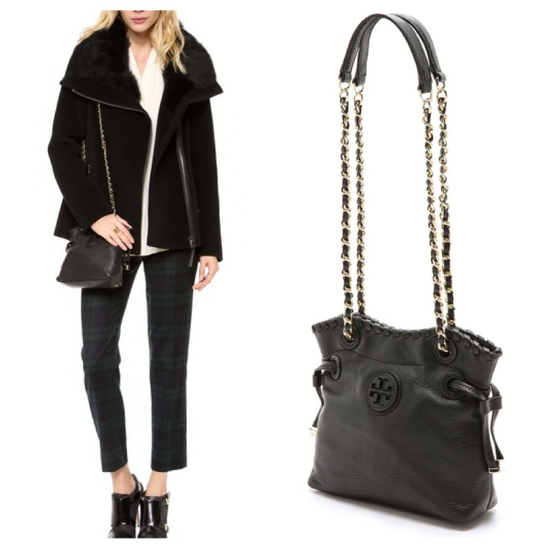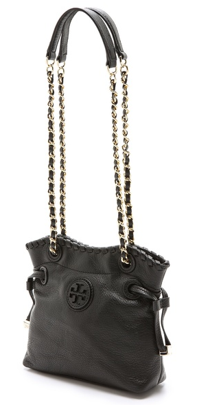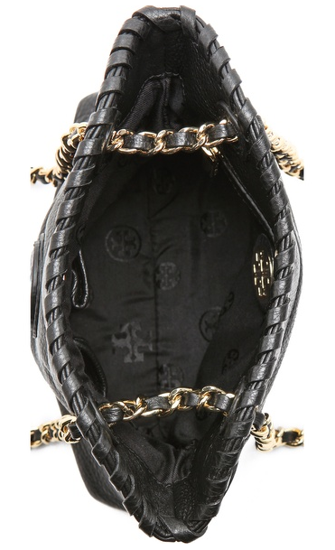 Whipstitching and a raised logo put a classic finish on a petite Tory Burch bag. Polished hardware shines at the drawstring sides and interwoven double handles. The magnetic top line opens to a lined interior with 3 pockets. Dust bag included.