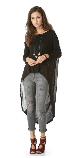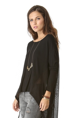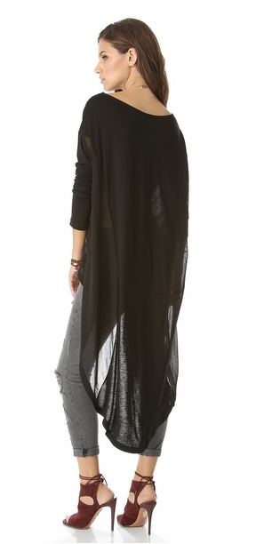 An asymmetrical hem offers a touch of drama to this Nightcap Clothing tunic, which is detailed with textured mesh panels. Boat neckline. Long sleeves. Semi-sheer.