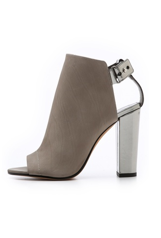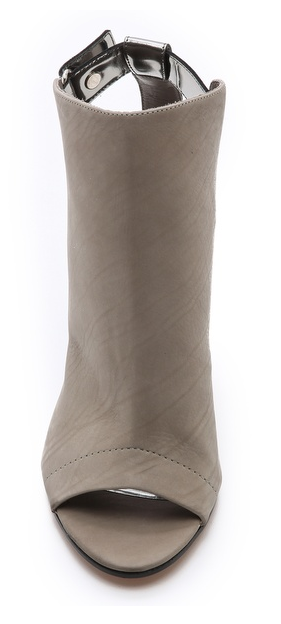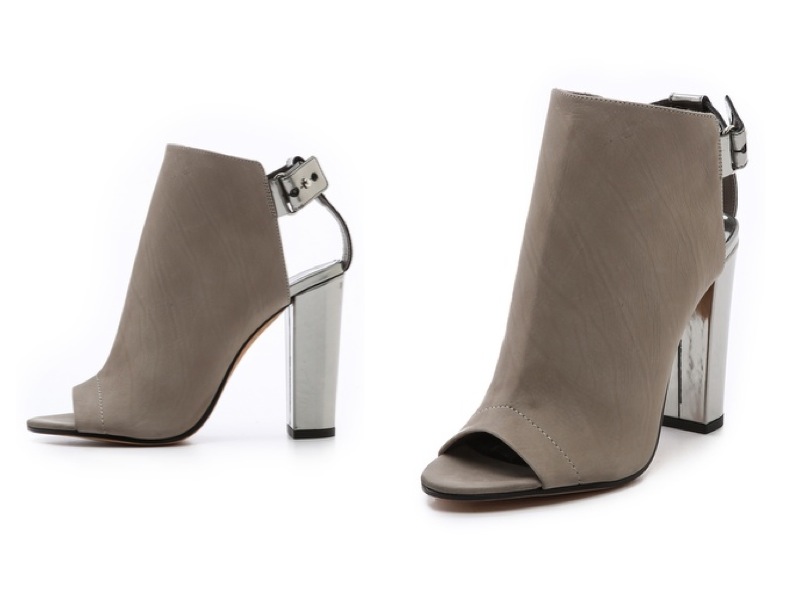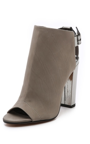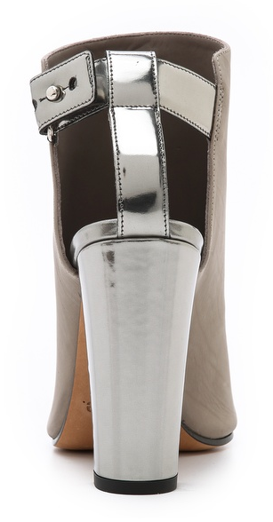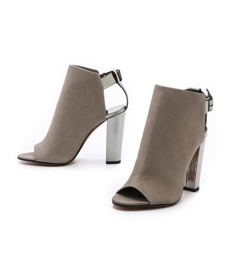 Metallic leather accents lend high-impact contrast to luxe nubuck Vince booties. Peep toe and chunky heel. Buttoned slingback strap. Leather sole.