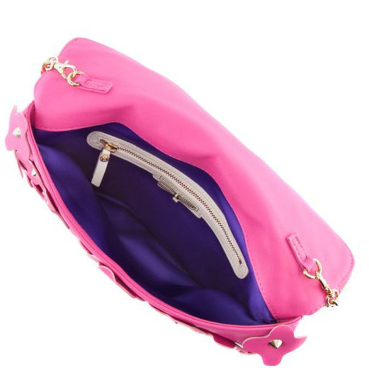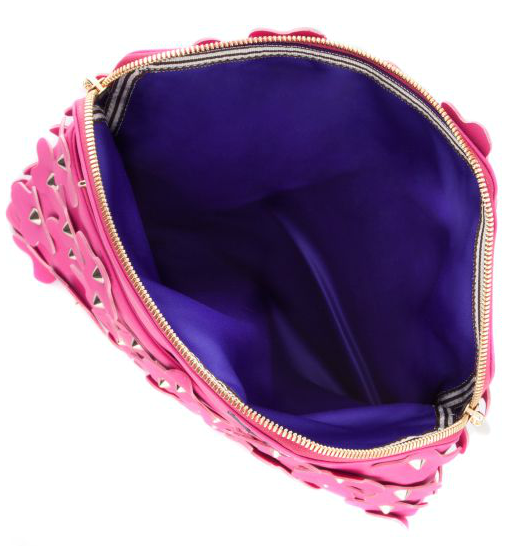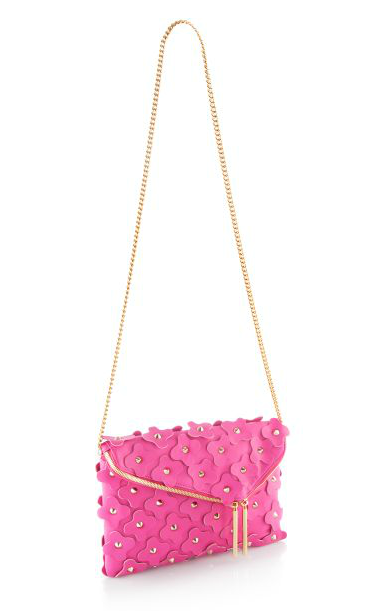The Debutante Asymmetric Floral Clutch is a designer handbag that makes a feminine fashion statement this season. This luxury handbag is crafted with genuine leather and gives a nod to the embellishment trend with allover leather flower appliqués with studded centers.