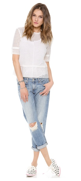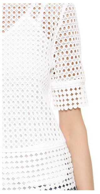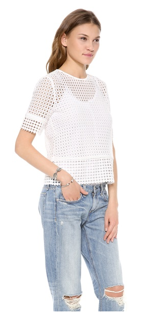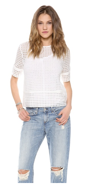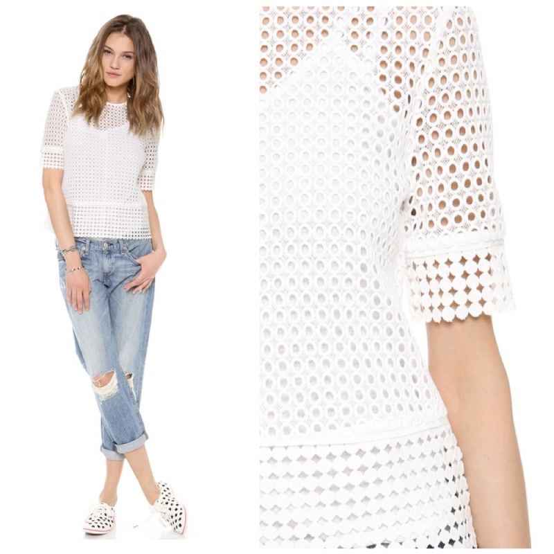 Dotted, crocheted edges complement the breezy feel of this Dolce Vita blouse, cut from eyelet lace. Silk crepe traces the seams and crew neckline. Hook-and-eye keyhole. Short sleeves. Sheer.
