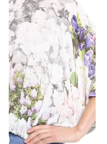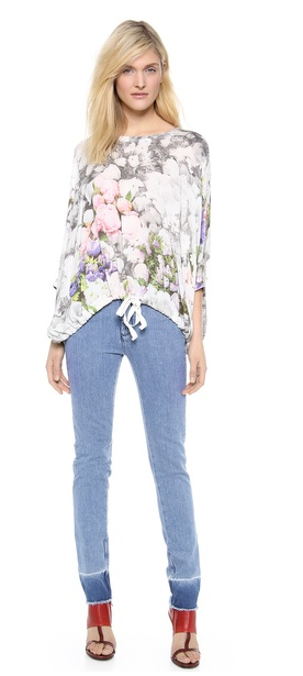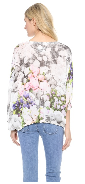 Pops of color accentuate the romantic floral pattern on a voluminous voile MM6 Maison Martin Margiela top. A drawstring gathers the hem, and banded cuffs complete the batwing sleeves. Scoop neckline.