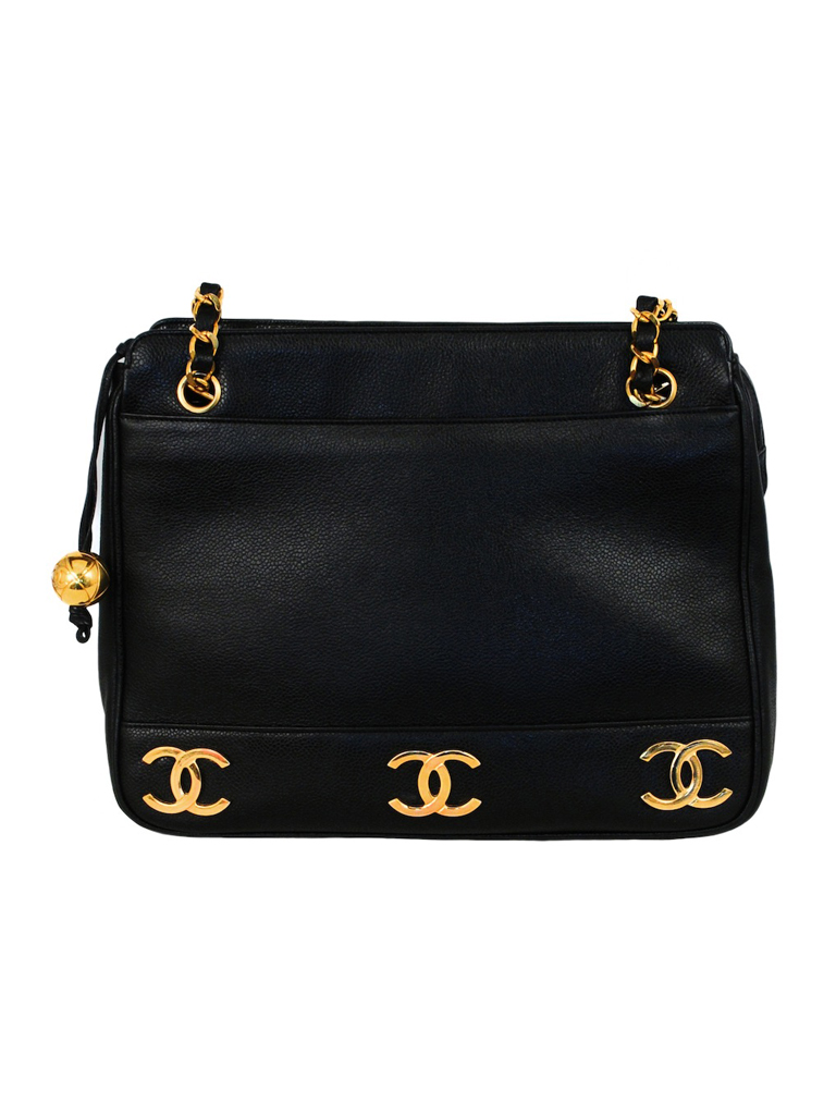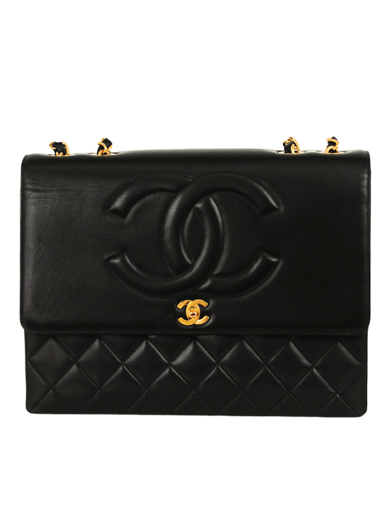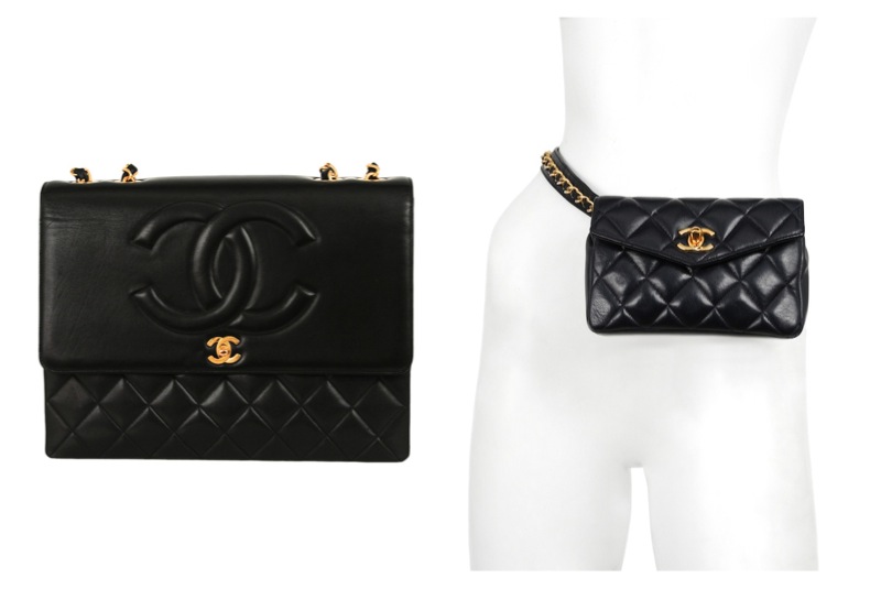 This hip bag is navy quilted leather with envelop front flap, classic mademoiselle CC closure, and chain detail along waist belt.