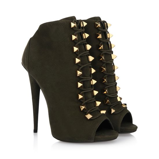 From eighties London, the peep hole ankle bootie in dark green tumbled nubuck leather with criss-cross laces and gold metal loops.