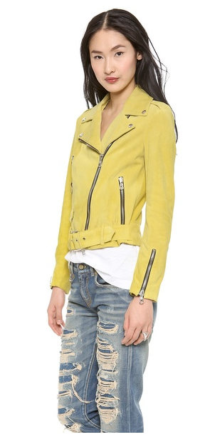 A classic MSGM moto jacket gets a modern update in vivid suede. Exposed zips secure the pockets, cuffs, and off-center placket, and a wide belt accents the waist. A petite snap pocket completes the casual look. Floral lining.