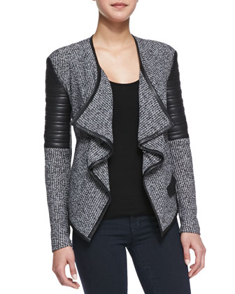 Generation Love boucle and faux-leather (polyester) cardigan features a shawl collar; open ruffled front. Long sleeves; quilted faux leather shoulders and zip cuffs.