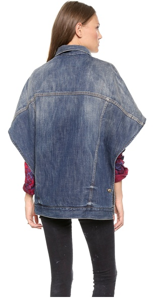 This R13 jacket balances classic denim styling with a modern look. A classic fold-over collar and buttoned placket pair with cape-style openings at the sides. Chained buttons fasten near the waist. A felted lining offers added warmth. Flap and slant pockets. Sleeveless.