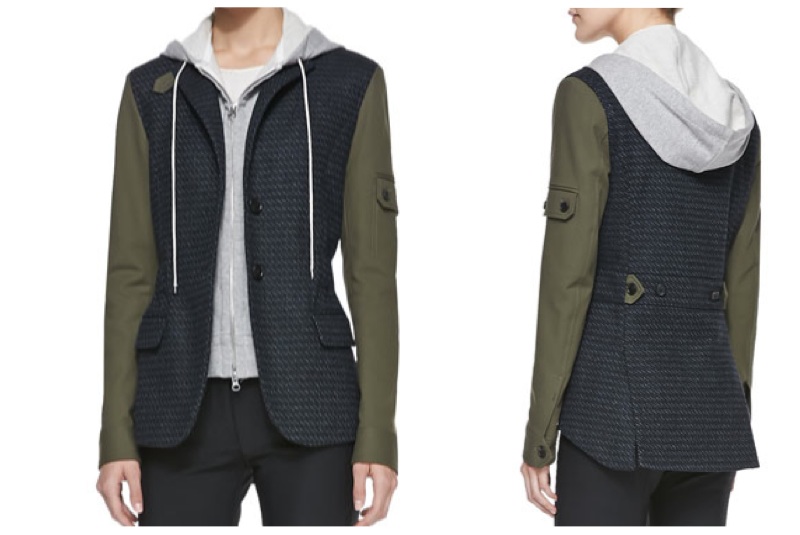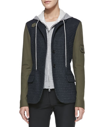 Veronica Beard tweed jacket with army sleeves. Removable hooded jersey dickey; zip front; self-tie drawstring. Notched collar; one-button front. Long sleeves; button pocket; one-button cuffs. Dickey cotton.